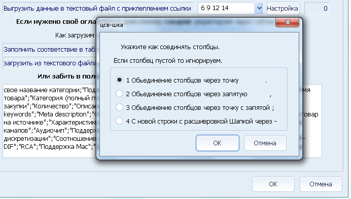 И выбираем какие столбцы куда кидать, можно и несколько закидывать, но тогда выбирать через кнопку «склейка», что между ними ставить.