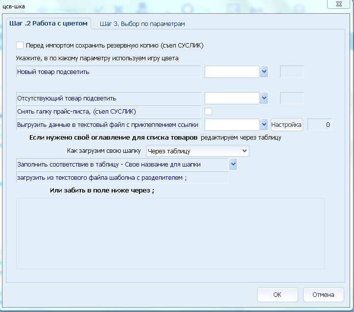 Иногда базовых возможностей программы не хватает( как в данном случае мало дополнительных полей описания. Вот тут мы решили выйти оригинальным способом. Можно выбрать необходимые данные с csv-файла и прикрепить их к карточке товара в простом текстовом документе, которым в дальнейшем можно воспользоваться при просмотре карточки товара (мы же его в дальнейшем будем использовать для других целей вне этой обработки).
