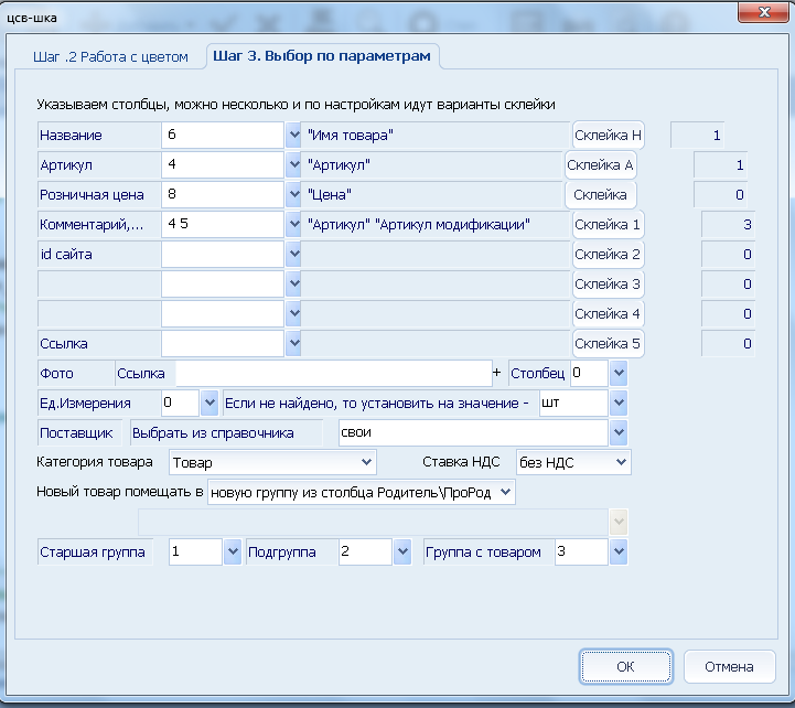 А вот в поле комментарий(это у нас дополнительное поле АТРИБУТ №1, которое можно включить непосредственно в настройках склада программы) у нас состоит из двух столбцов 4 и 5 которые содержат Артикул И Артикул Модификации. И соединены они через «склейка 1» «;»