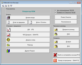 Обработки встроенные. Требуют наличие вашего MD файла для вноса изменений. Выводится окно Рабочего интерфейса кассира для упрощения жизни продвацам все выведено на одно окно. Есть Возможность выбора автооткрытия новых чеков после продаж и проверка на непроведенные чеки перед закрытием смены. Также включена возможность печати продавцами ценников и этикеток.